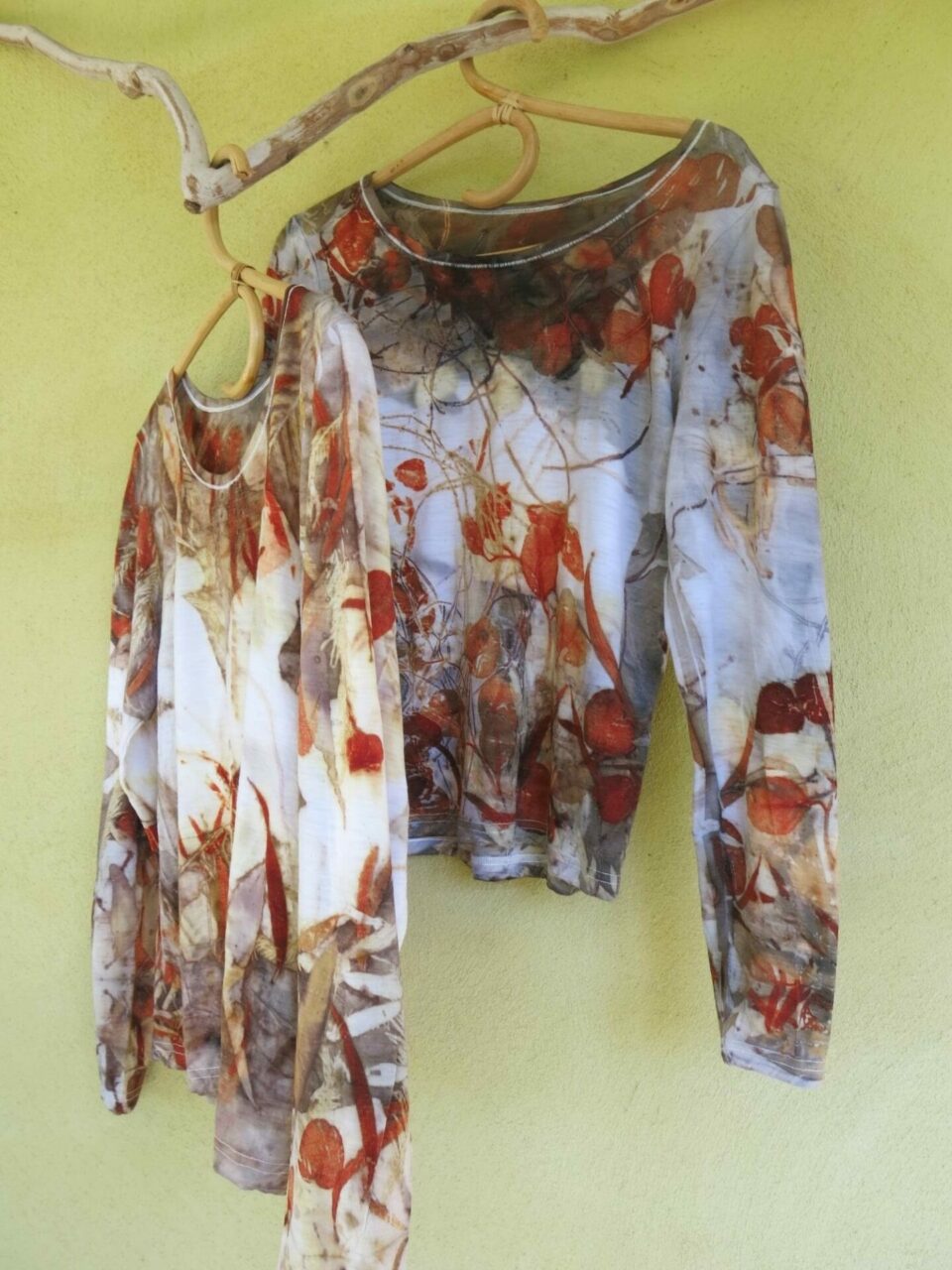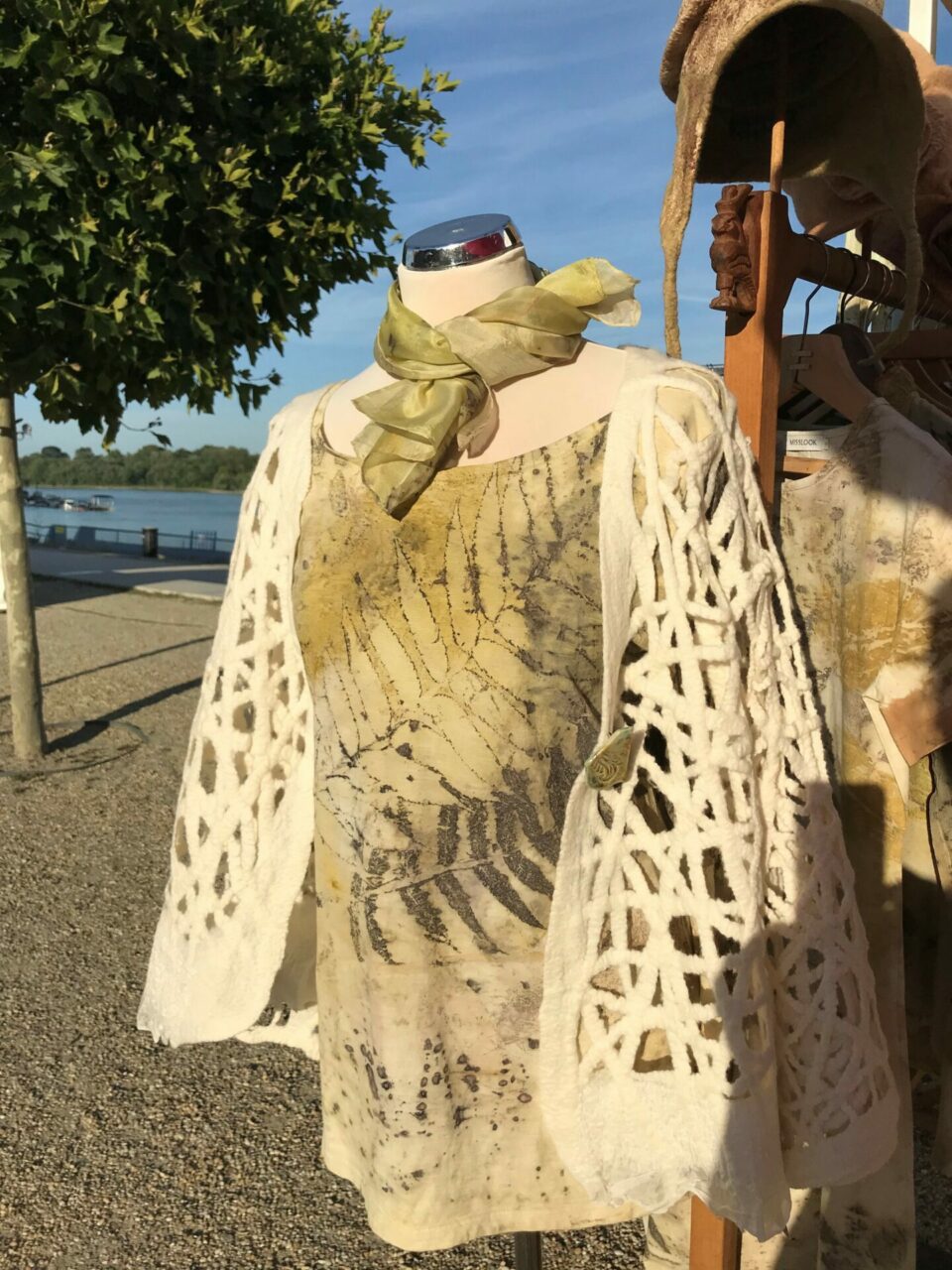 A merinó gyapjú és a tiszta hernyóselyem az alapanyag, amiből kalapjaim sáljaim készítem. Az ecoprit technikával festett felső ruhák szintén a természetet varázsolják az öltözékre. Faleveleket használok, festőnövényeket, amivel sűrűn telerakom a pólót, és hosszan gőzölöm.
